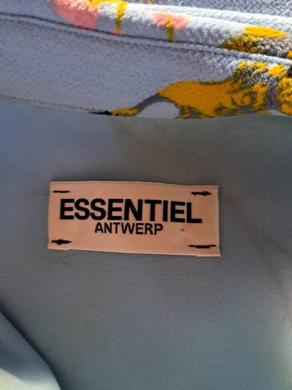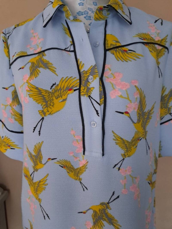 Terug in de tijd met dit tweedehands Essentiel retro jurkje. Een mooie kleur lichtblauw, kraagje en versierd met kraanvogels. Back to the disco.