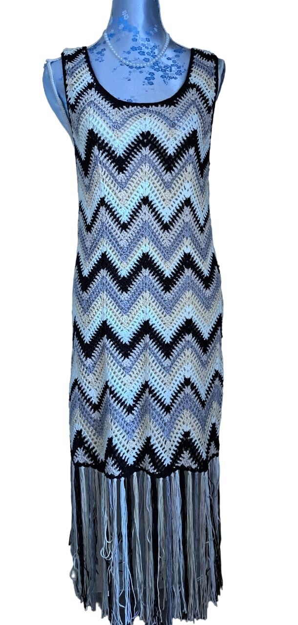 Dit tweedehands Boho Desiqual jurkje is gehaakt en heeft een onderjurk die vastzit aan het jurkje. Het jurkje heeft een mooie diepe halslijn en franjes aan de onderzijde.