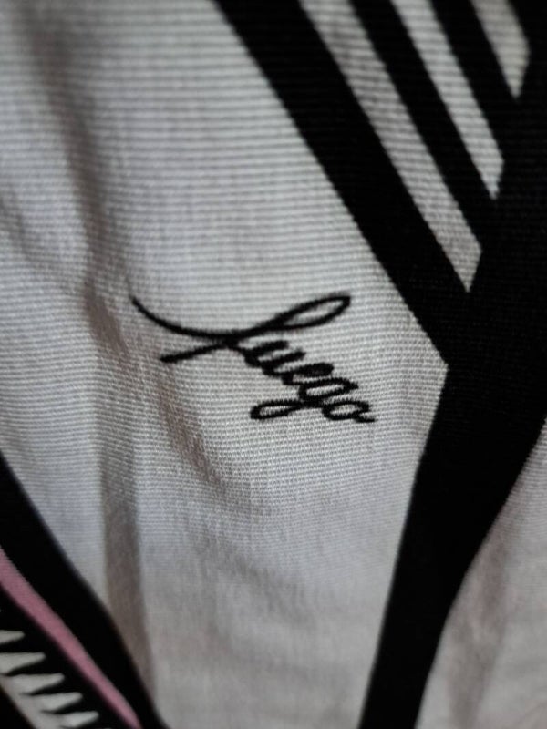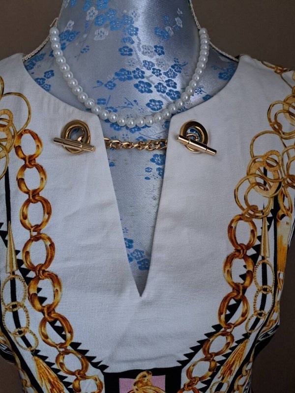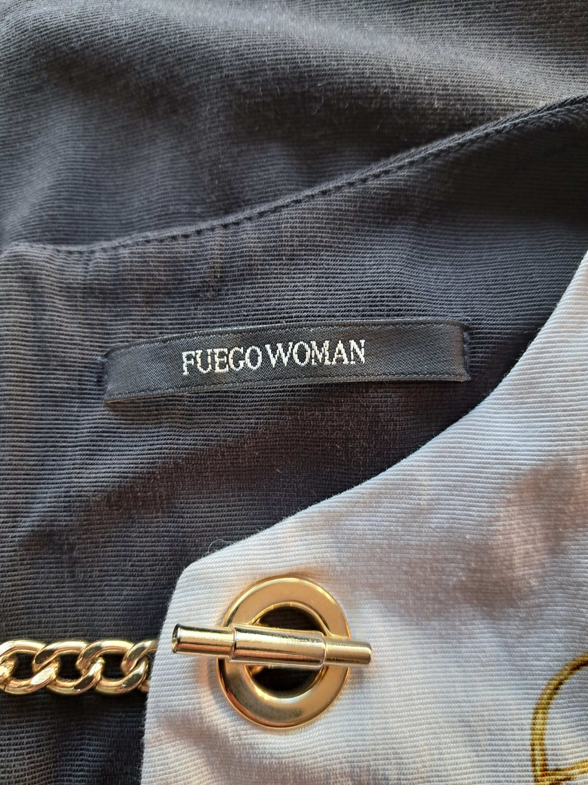 Heel bijzonder en opvallend tweedehands Fuego Woman zomerjurkje. Het jurkje heeft een mooi design, is gevoerd, heeft een rits op de rug en de halslijn is versierd met een metalen goudkleurig kettinkje.