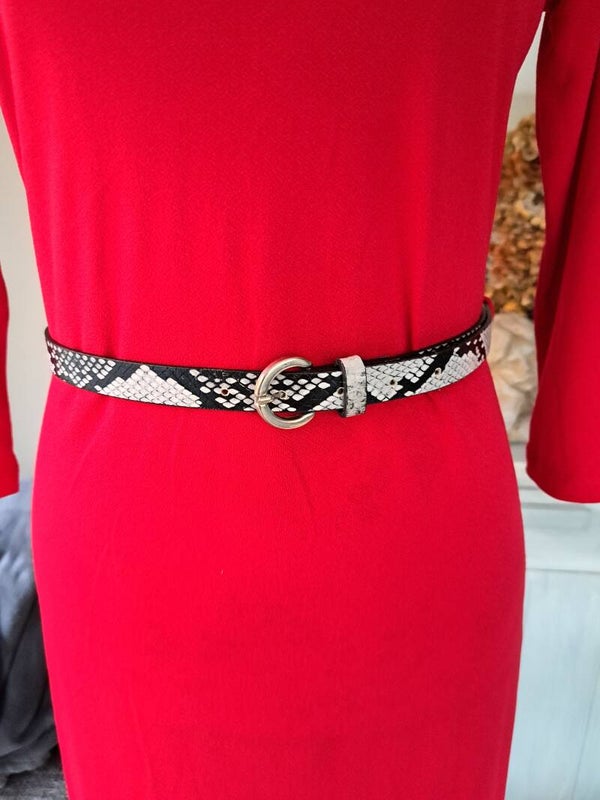 Dit leuke tweedehands rode jurkje past prachtig om jouw lichaam, heeft een mooie lengte en legt het accent op je taille door het contrasterende riempje. Het jurkje is niet gevoerd.