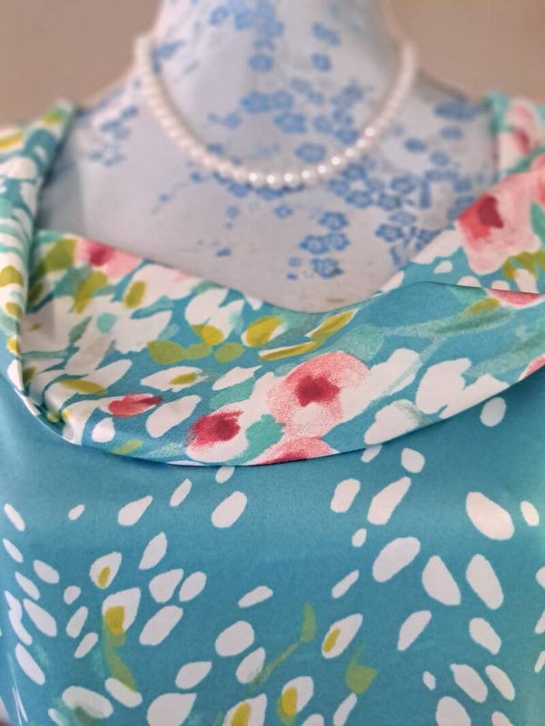 Dit tweedehands KARoO jurkje is werkelijk beeldschoon. Mooie kleuren, prachtige halslijn en een zachte gladde stof die zich langs je lichaam vlijt.