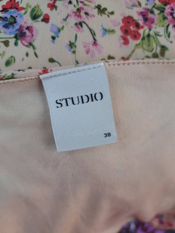 Schattig tweedehands Studio by Only bloemenjurkje. Het jurkje heeft ruches langs de halslijn en mouwen, sluit met een overslag en is gevoerd.
