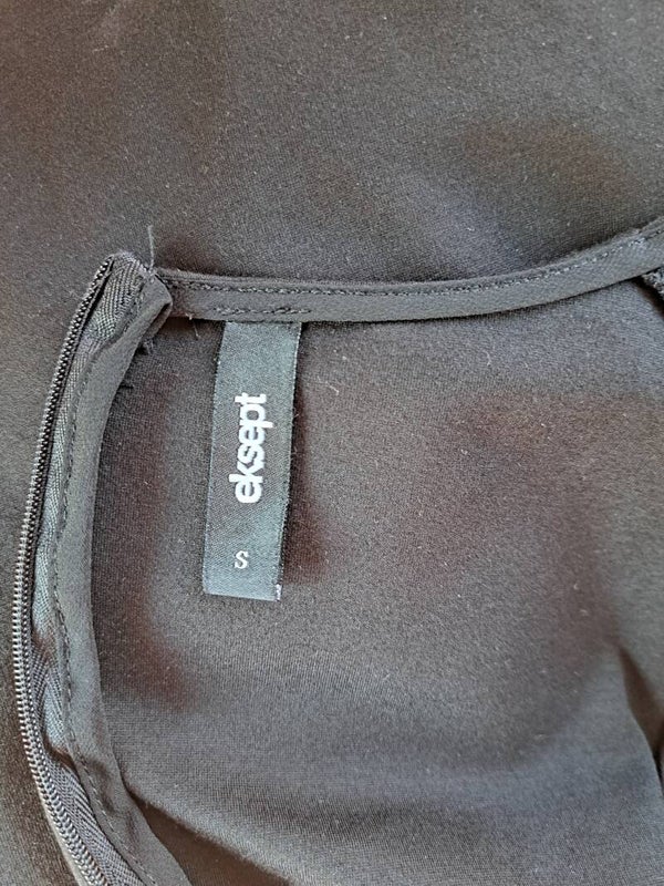 Dit schattig tweedehands Eksept jurkje heeft metalen ringen langs de halslijn, sluit aan de achterzijde met een rits en is niet gevoerd.