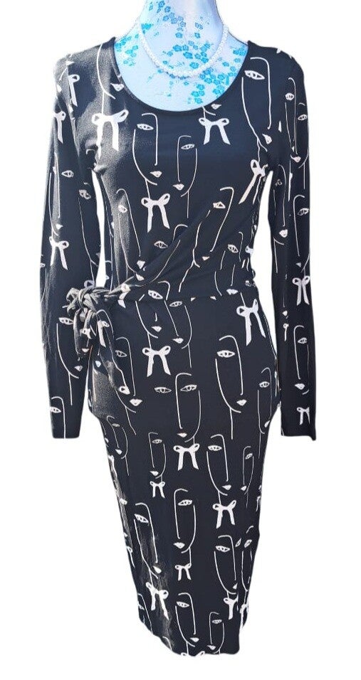 Mooie tweedehands Juffrouw Jansen kokerjurk. De jurk heeft een striklint in de taille, een hele leuke print en is niet gevoerd.