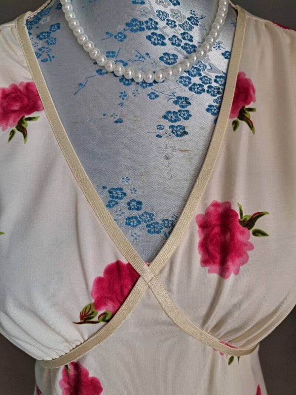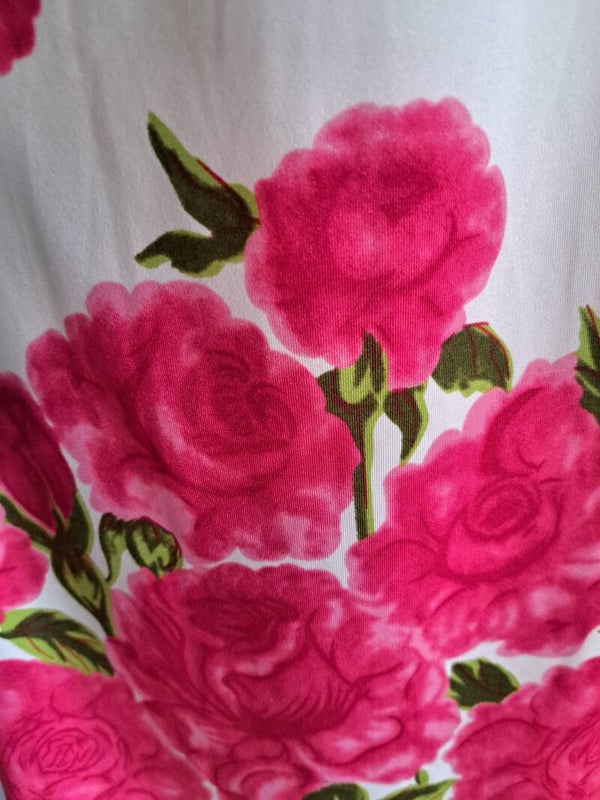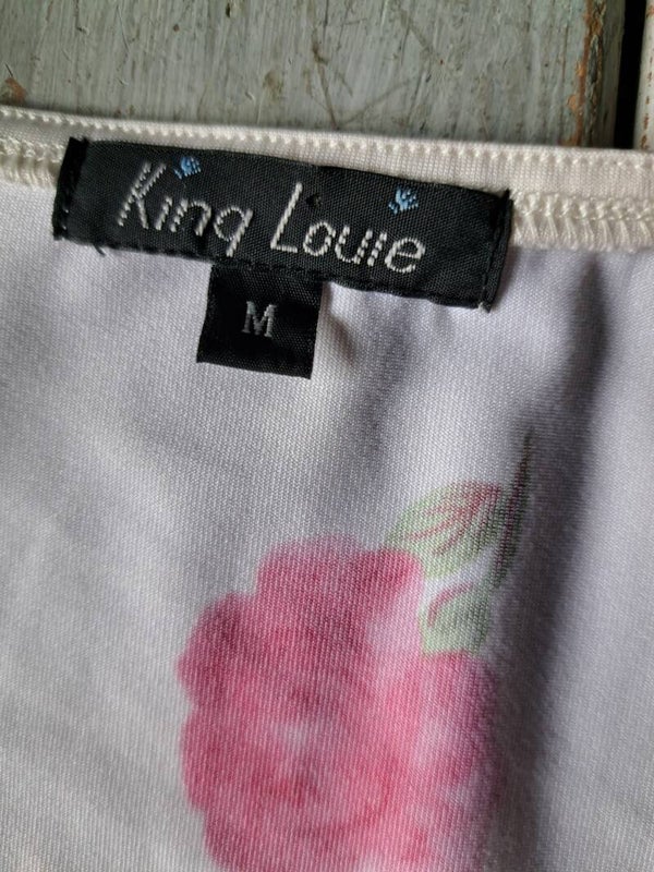 Schattig tweedehands King Louie zomerjurkje met roze bloemen. Het jurkje heeft een striklint verbonden met de mooie biesjes langs de halslijn en is niet gevoerd. Het jurkje is in goede staat.